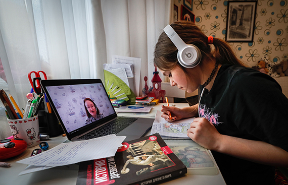 Россия. Москва. Девочка во время дистанционного урока с преподавателем. С 30 марта правительство Москвы ввело домашний режим самоизоляции для всех жителей города независимо от возраста. В России период с 28 марта по 5 апреля объявлен нерабочим для снижения темпов распространения коронавирусной инфекции COVID-19. EPA/YURI KOCHETKOV/ТАСС epa08331365 A student writes in a notebook during an online video lesson with her history teacher, at her home during the coronavirus emergency quarantine in Moscow, Russia, 29 March 2020 (issued 30March 2020). The Russian government has approved amendments to tighten liability for quarantine violations. According to the Russian Quarantine Service of Rospotrebnadzor (Russian Federal Service for Surveillance on Consumer Rights Protection and Human Wellbeing), eight people died and 1,534 cases of the Covid-19 disease have been confirmed in Russia. EPA/YURI KOCHETKOV
