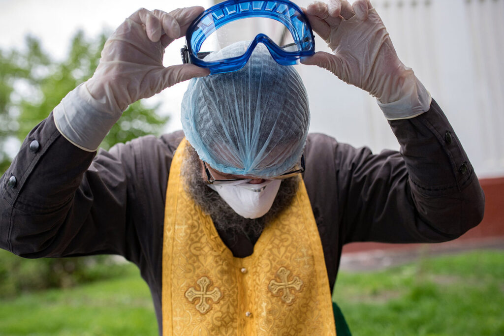 1. Очки, входящие в защитный костюм, многоразовые, каждому священнику выдали свои. После вызова они дезинфицируются. Очки быстро запотевают. По инструкции, чтобы очки не запотевали, их можно предварительно побрызгать спиртом, но это все равно не спасает. Лучше протереть их изнутри жидким мылом.