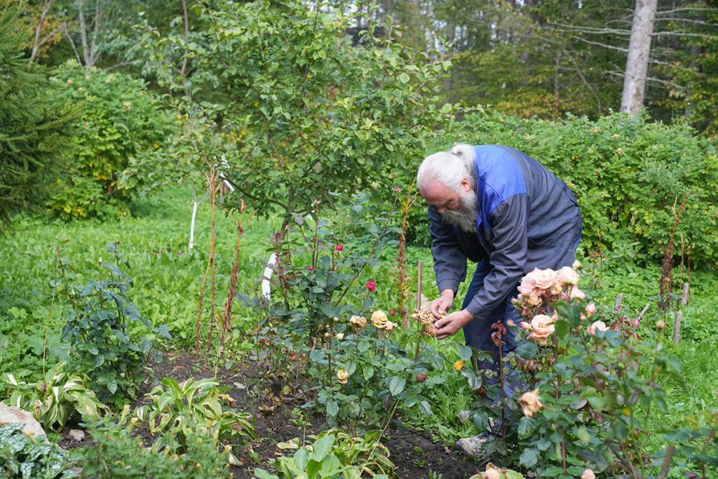 Да, было бы здорово. Отопление здесь печное, интернета нет, а свет по часам. Рядом с нашим вагончиком – большой кирпичный храм, он еще не восстановлен. Чуть поодаль – маленький деревянный храм в честь основателя монастыря преподобного Макария Римлянина, где находятся мощи святого. Завтра там будет литургия. Туда мы и несем цветы и пластиковые вазы с водой.