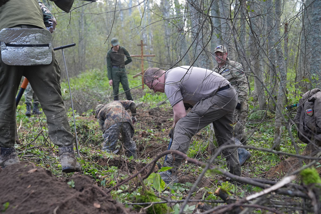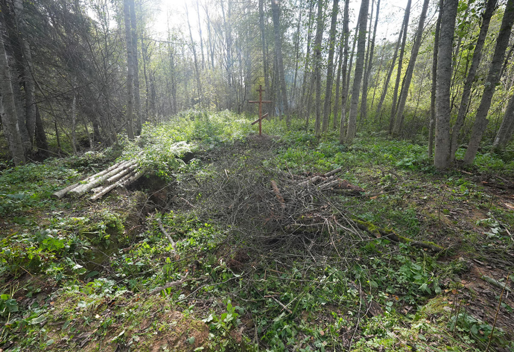 На месте первого захоронения, которое нашли весной 2025 года, стоит большой деревянный крест. Его поставили сами поисковики. Они предполагают, что рядом с уже обнаруженным захоронением находится второе. Здесь сегодня и будут вести поиск.