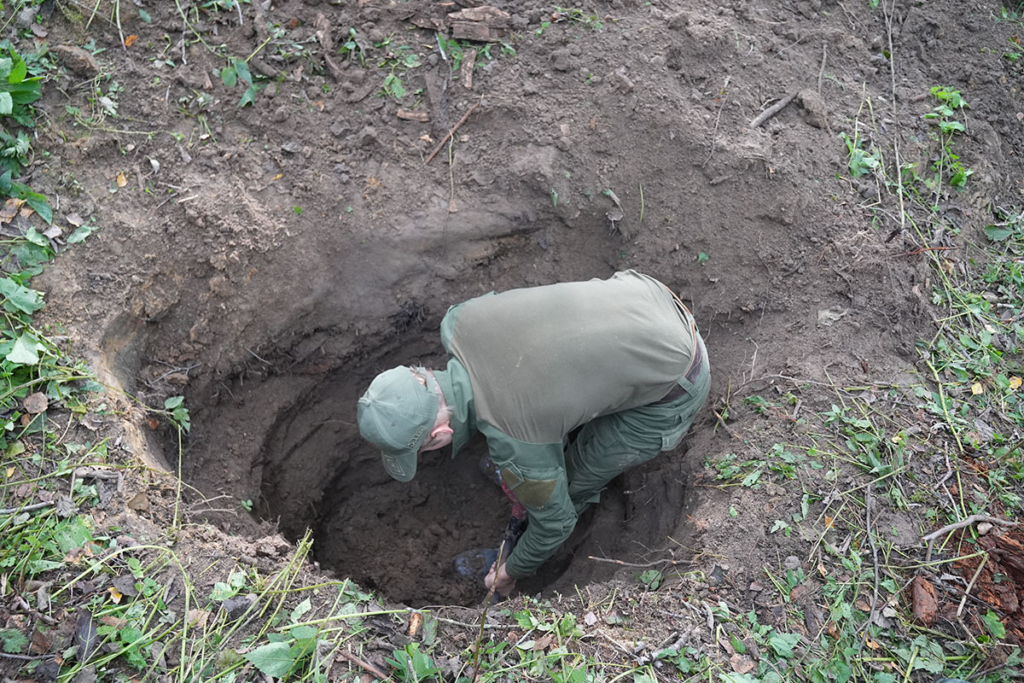 Копать тяжело. Максим уже по пояс в земле. Они с Егором меняются, так как яма глубокая, щуп проходит хорошо. Этот этап работы и называется «прощупыванием», он следует сразу после очистки местности.