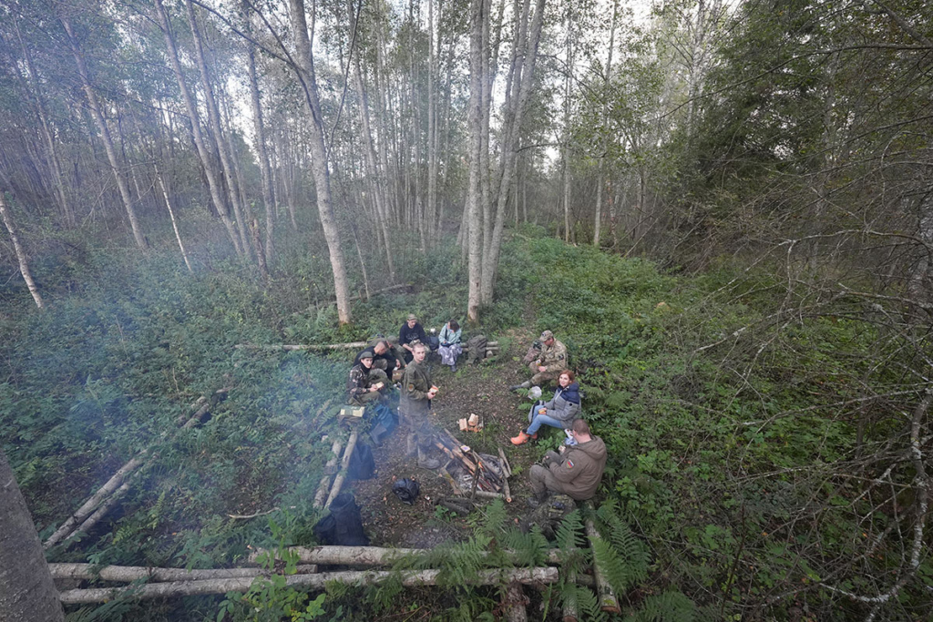 Солнце садится медленно, просачиваясь сквозь листву. Недалеко от раскопа горит костер, кто-то из ребят подкидывает дрова.