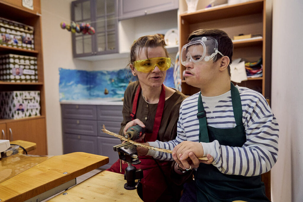 По пятницам в мастерской проходят групповые занятия. Ребята собираются в просторной комнате за большим столом. Каждому помогает воспитатель или волонтер. В будни есть индивидуальные уроки.