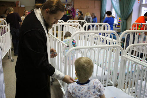 Поздравлять детей с Рождеством пришли добровольцы вместе с батюшкой. На снимке: священник Дионисий Денисов вручает малышу сладкое угощение