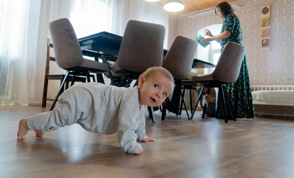 Нине шесть лет, Макарию пять, Леше два года, Ванюше пять месяцев. Все дела по дому Татьяна делает вместе с ними. Не заставляет – предлагает. Ваня кочует, то он на руках у мамы, то на ковре, то в детском стульчике, но всегда рядом со всеми. Смотрит во все глаза, как старшие протирают пыль или собирают игрушки.