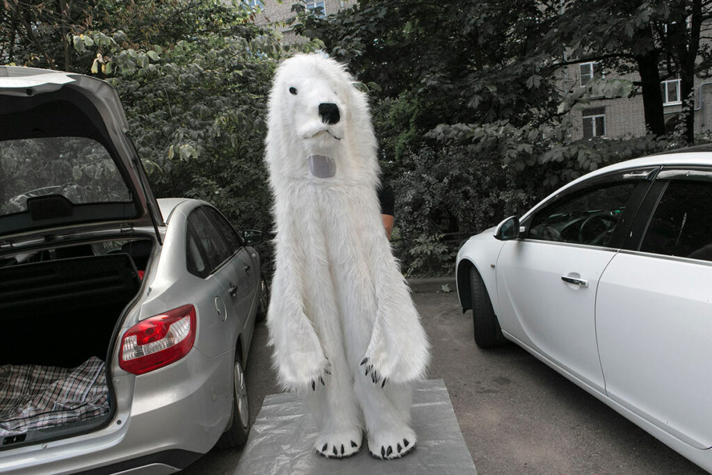 Белый медведь помещается в багажнике легковушки. В клеенчатой сумке в клетку лежит пушистая шкура с моторчиком. Костюм нужно не только надеть, но еще и надуть. Сергей снимает обувь, толстовку, на плечи накидывает жилетку с аккумулятором в кармане, вдевает ноги и руки в лапы, застегивает костюм и нажимает кнопку.