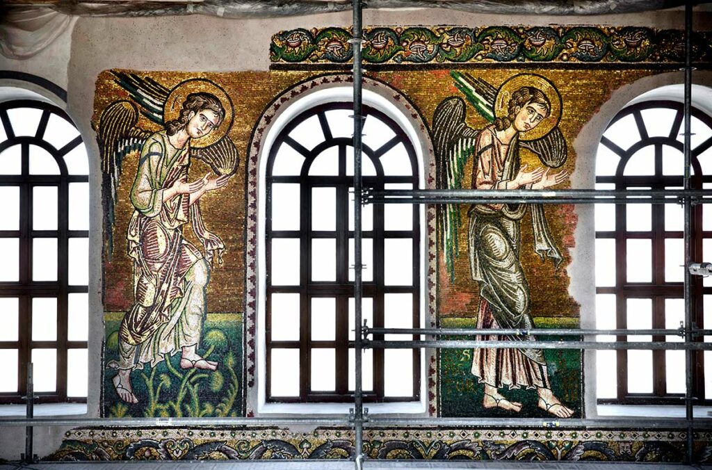 Реставрируя мозаику, художники сделали сразу несколько открытий. Во-первых, каждый кусочек золотой смальты в ней в древности был вмонтирован под своим определенным углом, чтобы лучше всего отражать солнечный свет и создавать вокруг фигур максимальное сияние.