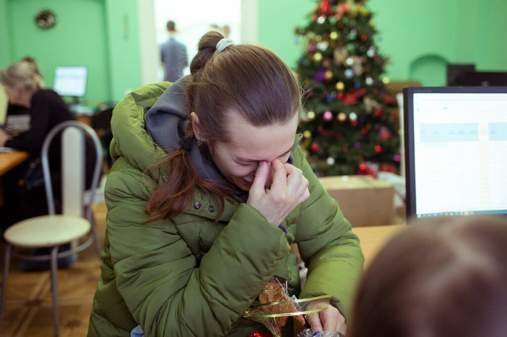 – Вот вам к Новому году сладенькое, – с сочувствием говорит куратор-волонтер, протягивая женщине пакет конфет. Куратор выслушала сотни подобных историй, но привыкнуть к такой концентрации человеческого горя так и не смогла. Каждый волонтер в штабе – человек одновременно устойчивый и отзывчивый. Без моральной силы помогать не получится, без участия – тоже. Беженцы идут в штаб не только за едой и одеждой. Им важно выговориться. Несколько десятков волонтеров дежурят в центре каждый день: кто-то работает напрямую с беженцами, кто-то сортирует вещи, кто-то помогает с бумажной работой.