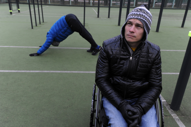 Мы встречаемся с ребятами, занимающимися параворкаутом, на спортивной площадке в Лужниках. На улице холодно, руки без перчаток замерзают быстро. 35-летний Станислав Бураков тоже забыл перчатки – но заниматься нужно. Согревает чай из термоса.