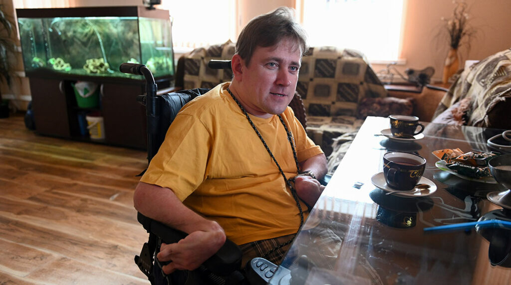 Без коляски Саша совершенно беспомощен. Из-за ДЦП он даже не может повернуться с боку на бок в постели. Каждый будний день к нему приходят двое мужчин из соцзащиты, чтобы поднять его и усадить в коляску. Соцработница помогает с утренними процедурами. В обед – еще один визит соцработницы, чтобы навести порядок, приготовить еду и покормить подопечного. Сам он не может ни кастрюлю достать из холодильника, ни налить чаю. Зато получается управляться самому с приборами.