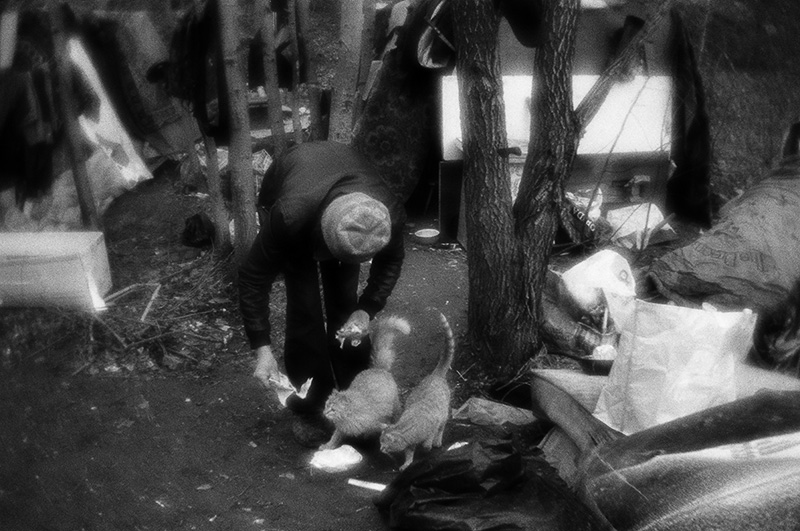 По словам фотографа, сначала жильцы лагеря относились к нему настороженно, но постепенно привыкли. «Бездомные фаталистично относятся ко всему происходящему, живут одним днем. Я пытался помогать им – приносил одежду, еду, но так как они не ждут этого, то воспринимают это очень спокойно».