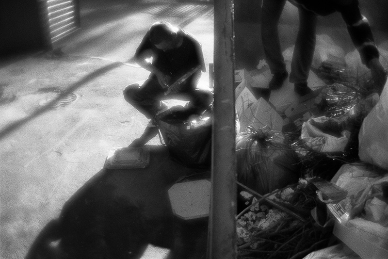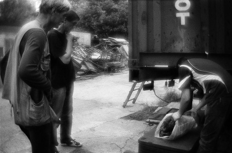 Алексей (по кличке «Циклоп») и Борис ломают ящики на дрова для печки. На заднем плане виден дом, где в квартире живет отец Бориса. Причину, по которой Борис предпочел жизнь на улице жизни с отцом, я не спрашивал, но, очевидно, это, как и большинства остальных, плохие отношения с родственниками.