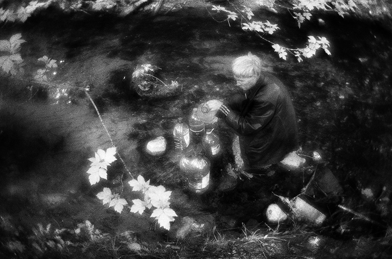 Саша набирает воду для «технических нужд» в речке, протекающей по дну оврага