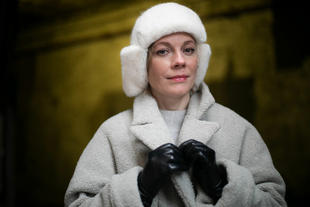 Юлия Корсунская. женщина в белой шубке и шапке в арке подъезда. Санкт-Петербург