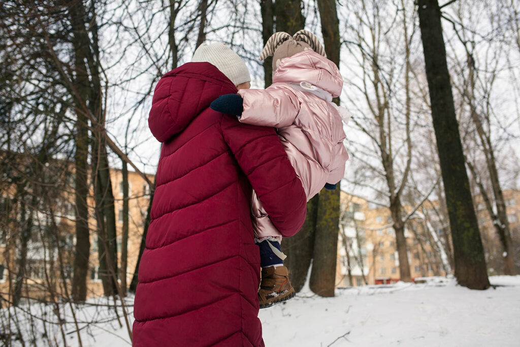 Женщина на спортивной площадке, в красном пуховике и с маленькой девочкой на руках