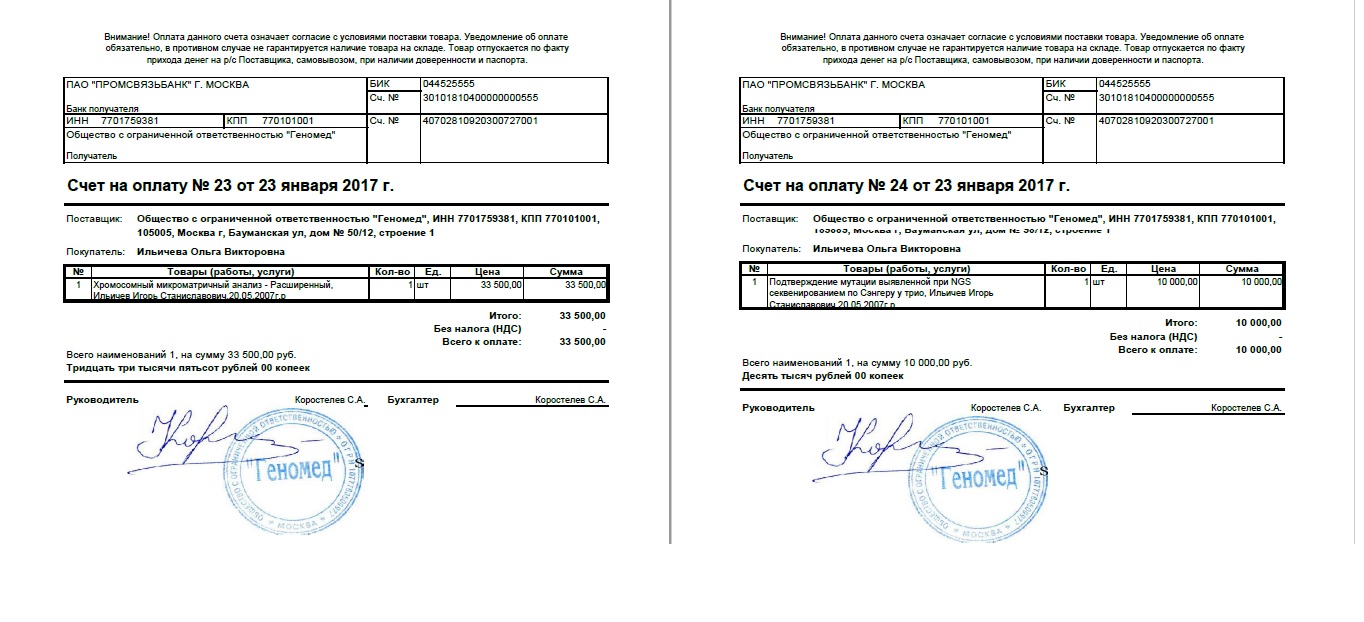 Стоимость исследования в лаборатории «Геномед», согласно счету, 43 тысячи 500 рублей.