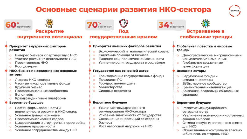 – «Раскрытие внутреннего потенциала» (60% вероятности) эксперты называют наиболее желательным. Он строится на проактивности самих НКО, росте интереса бизнеса к социальному партнерству и вовлеченности граждан в добровольчество и благотворительность. В этой модели некоммерческие организации становятся главными инициаторами социальных изменений;