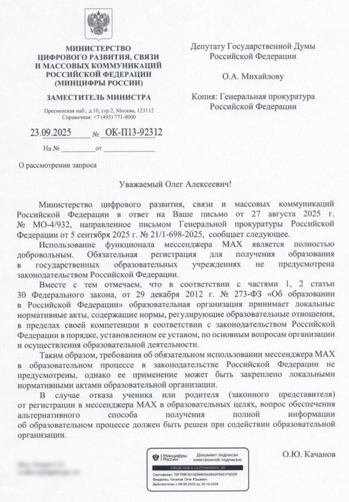 Об этм говорится в официальном ответе министерства на запрос депутата Госдумы Олега Михайлова в прокуратуру в связи с «навязыванием использования мессенджера в образовательных учреждениях». Политик опубликовал текст полученного документа.